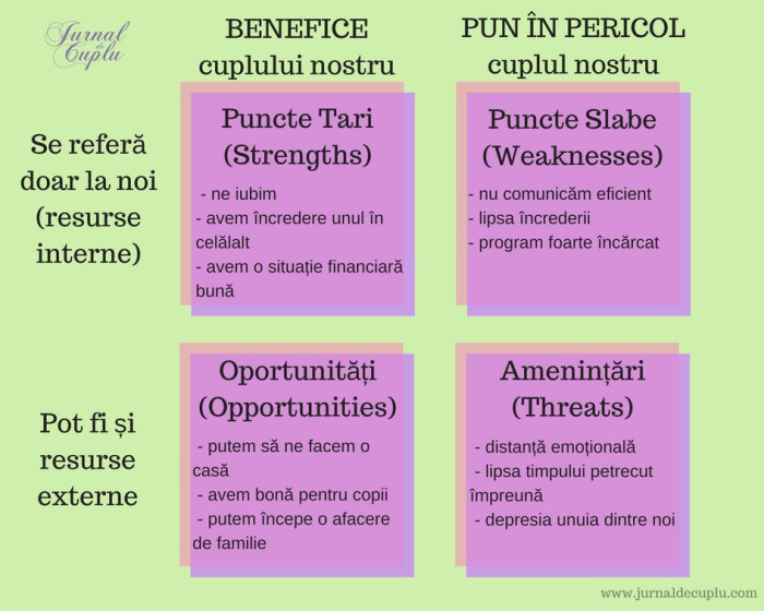 Însă, la fel de bine, această analiză se poate aplica și în cazul unei cuplu, deoarece este recomandat ca partenerii să își cunoască și să își înțeleagă relația, astfel încât să o poată construi pe baza punctelor tari, să lucreze și să elimine punctele slabe din cadrul ei, să exploateze oportunitățile și să fie atenți și să îndepărteze amenințările la care poate fi expusă. În acest mod, aceștia își vor putea direcționa relația către una frumoasă și împlinitoare.