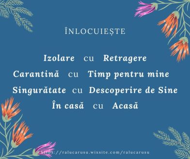 Analiză, autoanaliză, critică, judecată, întoarcere la sine, lucru cu sine, acceptare, adaptare… iată procesele cu care îmi ocup timpul zilele astea. După cum spuneam, pentru prima oară, după foarte mult timp, mă simt odihnită. Iar asta îmi permite să mă ocup mai mult de lumea mea interioară. Trigger-e exterioare sunt din plin, însă percepția mea este cea care definește forma realității pe care o experimentez. Nu mai sunt pe pilot automat și am timp – să gândesc, să văd, să aud, să simt, să trăiesc, să exist, pur și simplu. M-a surprins să constat că, de fapt, cauza oboselii mele cronice nu erau copiii, nici partenerul, nici ședințele. Sunt, în continuare, cu toate acestea chiar și acum, în izolare. Singurele lucruri pe care le-am exclus, în realitate, au fost ieșitul în oraș, la restaurant, mersul la cumpărături, mersul la cabinet, viața socială, dusul la școală/grădiniță al copiilor. Și iată-mă, mai odihnită decât am fost în ultimii… probabil 15 ani. 😜 De unde înțeleg, în sfârșit, că viața socială nu este punctul meu forte. Dacă vreau să schimb asta? Nu. Sunt fericită doar că am conștientizat acest lucru și pot continua acum să mă bucur de această izolare, fără urmă de vinovăție ori obligație.